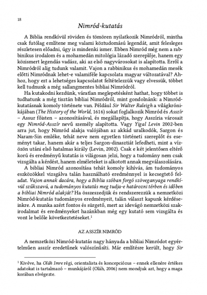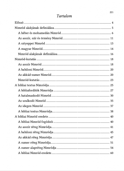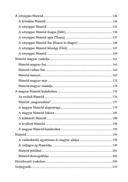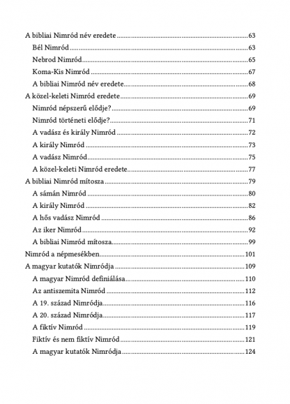 Kicsoda Nimród? A könyv e kérdésre keres tudományos választ. Összegyűjti és rendszerezi a kutatási eredményeket, feltárja a vadászkirály alakját, és megkísérli rekonstruálni eredetét. Jelen munka joggal tartható hiánypótlónak és mérföldkőnek a hazai és a nemzetközi Nimród-kutatásban. A magyar őstörténet rajongóinak, bibliafordítóknak és vadászoknak kötelező olvasmány.